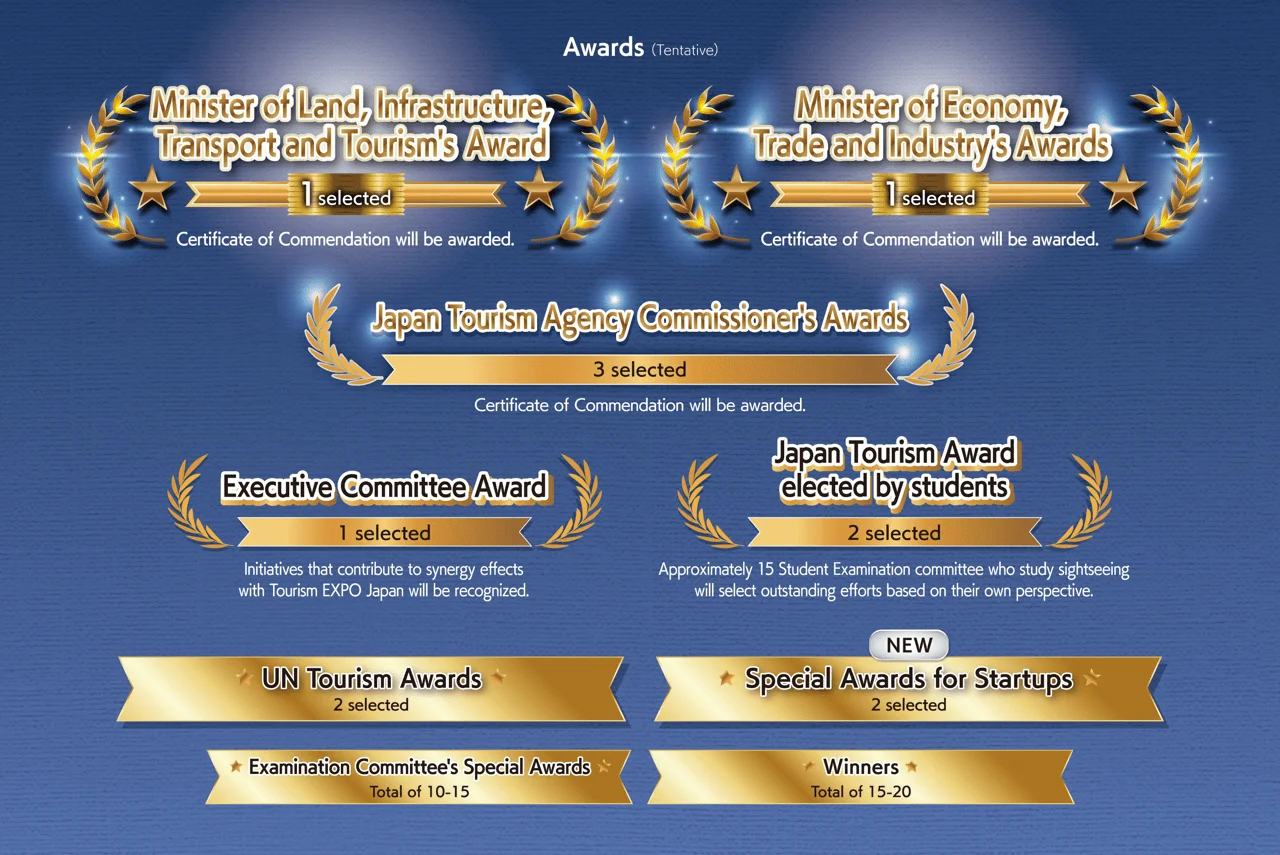 To achieve this goal, tourism needs to be engaged in addressing a diverse range of issues, including contributing to local communities, ensuring safety and security, enhancing productivity, and protecting our environment. The Japan Tourism Awards will recognize the efforts of organizations, companies, and groups and individuals that play a major role in ensuring the revival and sustainability of the "power of travel" by drawing attention to their exemplary initiatives. The awards-winning initiatives will be widely publicized throughout the world in collaboration with Tourism EXPO Japan 2026 as model cases with the aim of contributing to the future development of tourism.